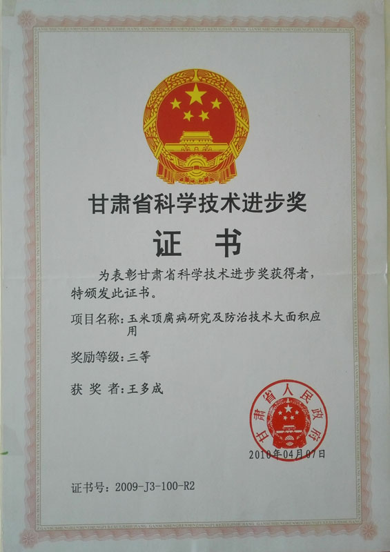 2010年榮獲甘肅省科學(xué)技術(shù)進(jìn)步三等獎(jiǎng)證書 | ||