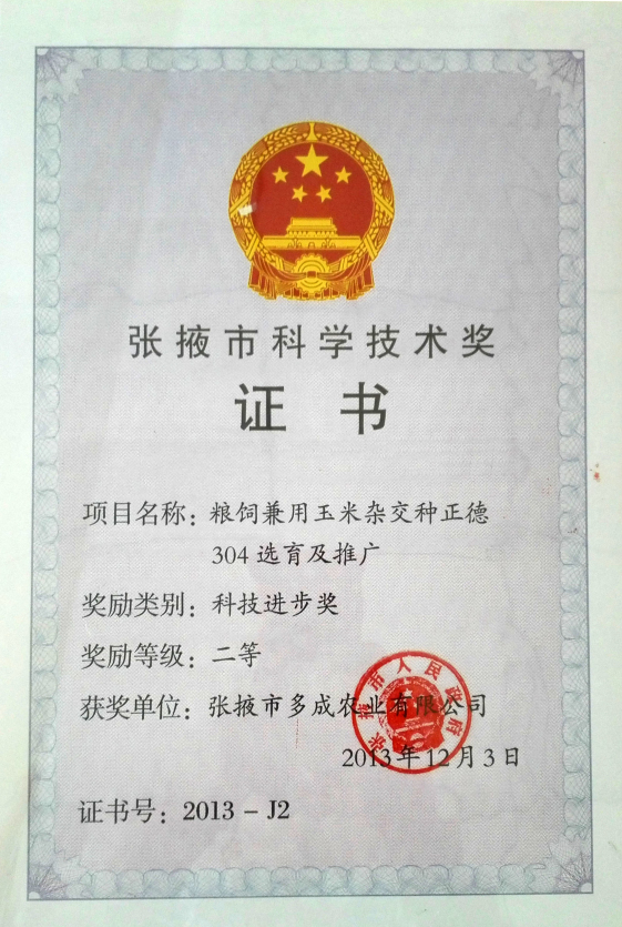 糧飼兼用玉米雜交種正德304選育及推廣——張掖市科學技術(shù)進步獎二等獎