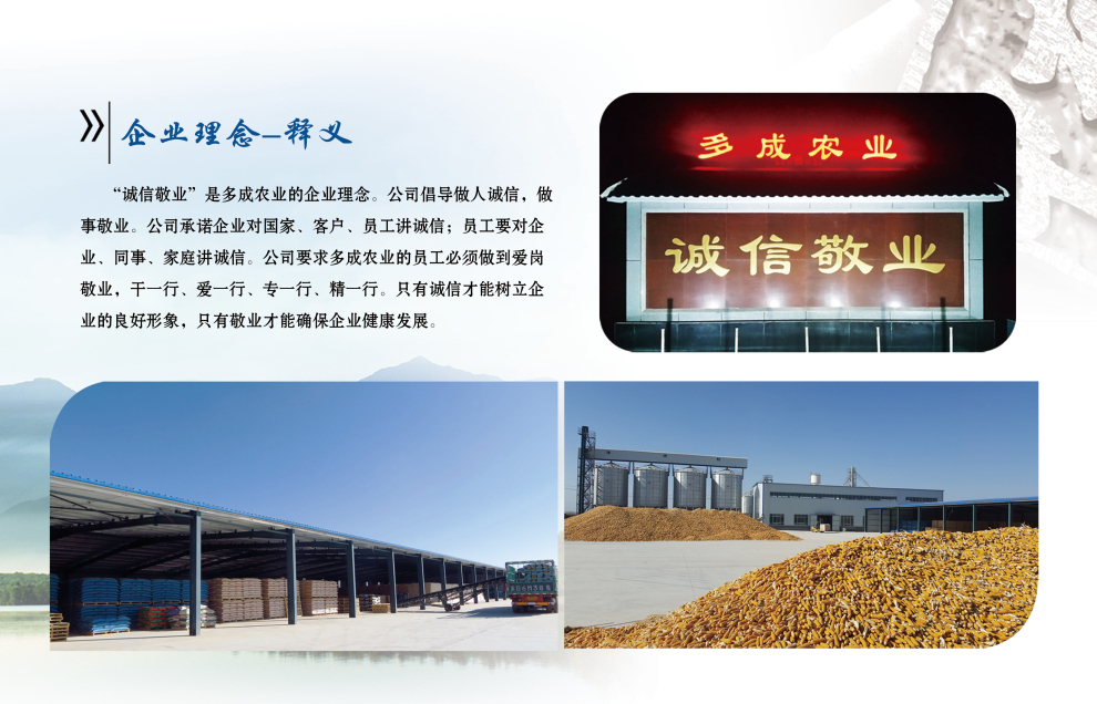 "誠信敬業(yè)“是多成農(nóng)業(yè)的企業(yè)理念。公司倡導(dǎo)做人誠信,做事敬業(yè)。公司承諾企業(yè)對國家、客戶、員工講誠信;員工要對企業(yè)、同事、家庭講誠信。公司要求多成農(nóng)業(yè)的員工必須做到愛崗敬業(yè),干一行、愛一行、專一行、精一行。只有誠信才嫩個(gè)樹立企業(yè)的良好形象,只有敬業(yè)才能確保企業(yè)健康發(fā)展 |